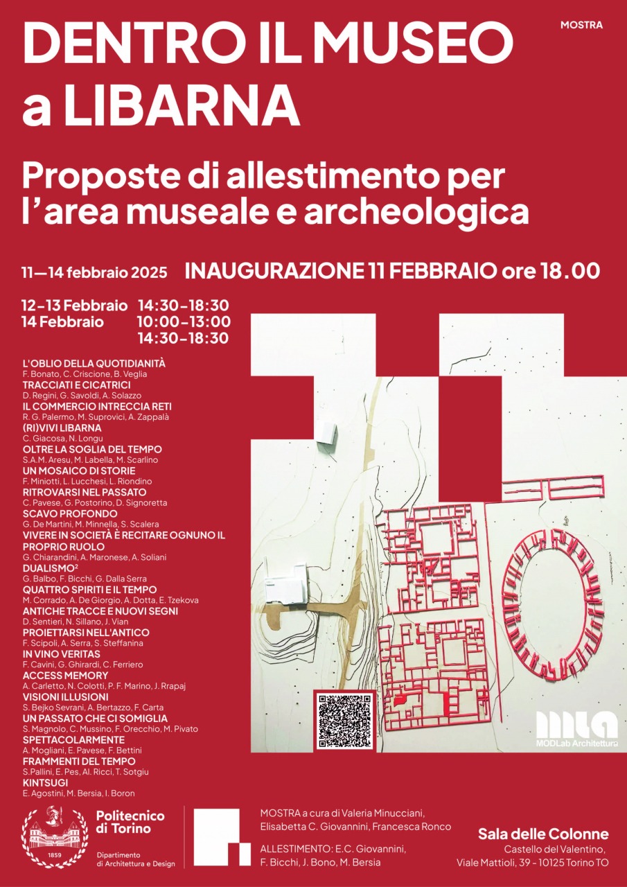 La Mostra 'DENTRO IL MUSEO a LIBARNA. Proposte di allestimento per l'Area Museale e Archeologica' raccoglie gli esiti dell’attività didattica del Seminario Introduttivo Dentro il Museo. La Mostra è stata allestita in collaborazione con gli studenti del corso del Seminario Introduttivo a.a. 2024/2025 presso la Sala delle Colonne del Castello del Valentino a Torino. La mostra è rimasta aperta al pubblico dall'11 febbraio al 14 febbraio 2025. La Mostra ha coinvolto tutti gli studenti iscritti al Seminario Introduttivo 'Dentro il Museo' a.a. 2024/2025 ed è stata curata dalla Prof.ssa Valeria Minucciani, Prof.ssa Elisabetta Caterina Giovannini, Arch. Francesca Ronco, Arch. Gianluca D'Agostino.